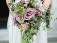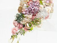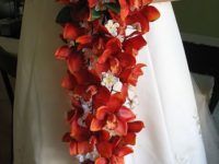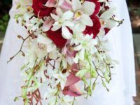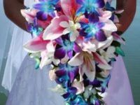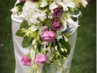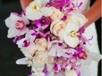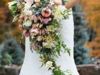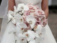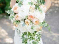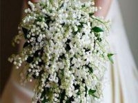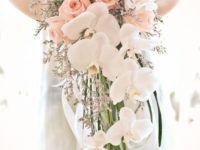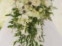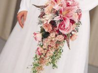 Um dos buquês mais utilizados é o buquê cascata, ele fica ótimo nas noivas mais altas e gordinhas, ele apresenta flores no topo do buquê, e folhagens e flores que vão se esparramando de forma natural formando uma cascata. Esse tipo de buquê também pode contar com pedrarias que vão valorizar ainda mais o visual.
