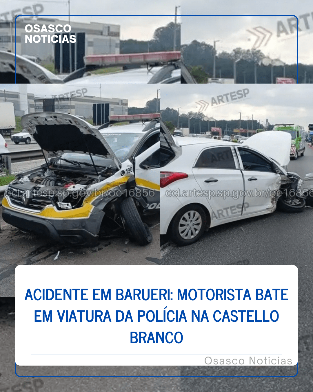<p data-start="193" data-end="499">Um acidente inesperado aconteceu na manhã desta quarta-feira (15) em Barueri. Por volta das 8h, um motorista de um Hyundai HB20 acessou o acostamento da <strong data-start="346" data-end="382">Rodovia Castello Branco (SP-280)</strong>, no km 21, e colidiu lateralmente com uma viatura da <strong data-start="436" data-end="466">Polícia Militar Rodoviária</strong>, que seguia pelo mesmo trecho.</p>