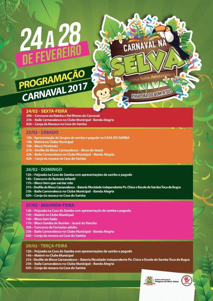 A prefeitura de Pirapora do Bom Jesus definiu a programação do carnaval 2017 na cidade. O tema neste ano é: “Carnaval na Selva – Uma Folia Amazônica”. Por se tratar de uma festa tradicional e que reúne toda a cidade para as festividades, a Secretaria de Cultura não poupou esforços e, neste ano, a festa inclui bailes, desfiles, escolha de rainha e rei momo e, claro, a tradicionalíssima Canja da Ressaca.