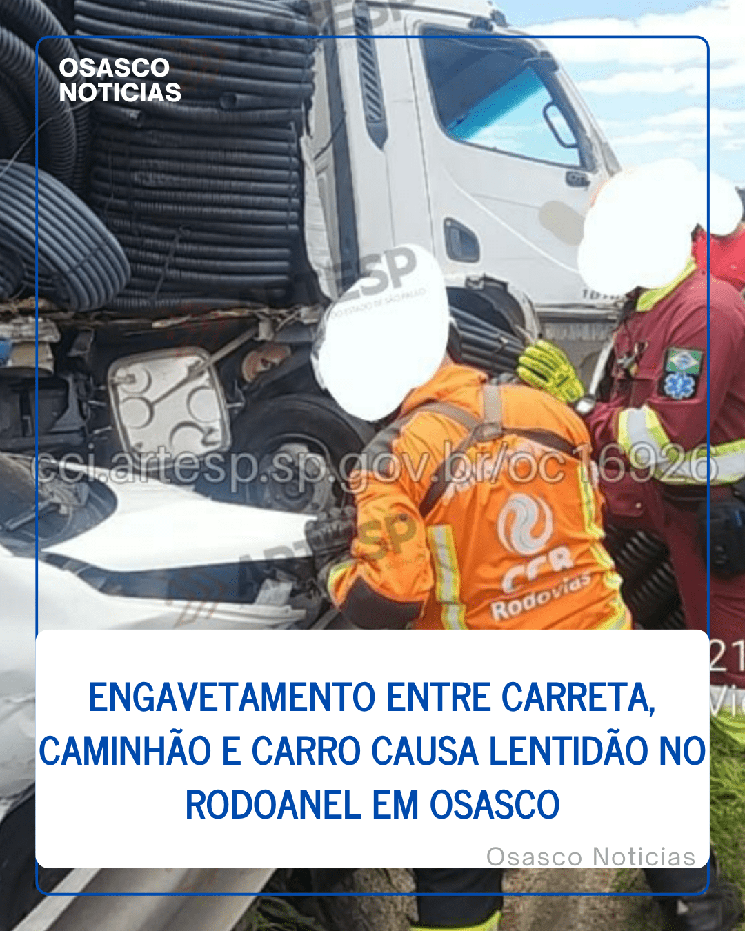 <p data-start="93" data-end="281">Um engavetamento envolvendo uma <strong data-start="125" data-end="173">carreta, um caminhão e um veículo utilitário</strong> deixou o trânsito complicado no <strong data-start="206" data-end="230">Rodoanel Mário Covas</strong>, em <strong data-start="235" data-end="245">Osasco</strong>, na tarde desta terça-feira (21).</p>