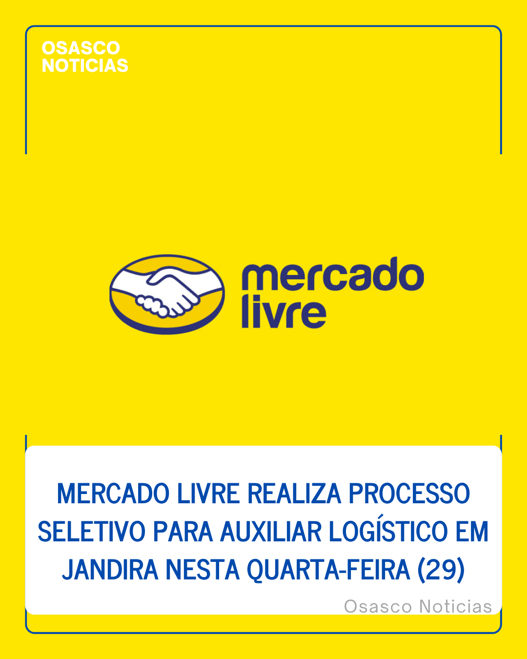 <p data-start="106" data-end="403">O <strong data-start="108" data-end="125">Mercado Livre</strong> vai promover um <strong data-start="142" data-end="174">processo seletivo presencial</strong> para o cargo de <strong data-start="191" data-end="213">Auxiliar Logístico</strong> na próxima <strong data-start="225" data-end="256">quarta-feira, 29 de outubro</strong>, em <strong data-start="261" data-end="272">Jandira</strong>. A seleção acontecerá no <strong data-start="298" data-end="329">Teatro Municipal de Jandira</strong>, localizado na <strong data-start="345" data-end="379">Rua Rubens Lopes da Silva, 400</strong>, a partir das <strong data-start="394" data-end="400">9h</strong>.</p>