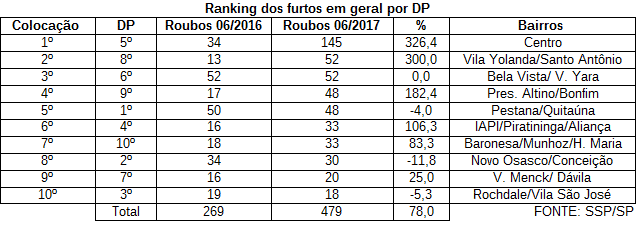 Caindo para a segunda colocação, o 8º DP, Vila Yolanda/Santo Antônio, aponta com 152 fatos ante 166, redução de 8,4%. Em terceiro, vem o 6º DP, Bela Vista/Vila Yara, com 106 contra 104, leve alta de 1,9%.