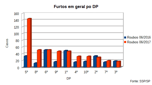 Os casos de furtos em geral na região do 5º DP, no Centro, continuam em alta na cidade apresentando uma alta de 326,4% em julho, Aumento de 145 para 34. Na sequência surge o 8º DP, com 52 contra 13, elevação de 300%. Em terceiro está o 6º DP, Bela Vista/Vila Yara, com 52 fatos, a mesma quantidade do ano anterior.