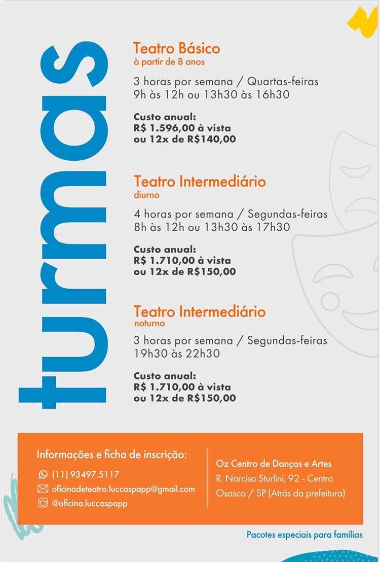 A oficina de atores é dividida em diferentes turmas com aulas às quartas-feiras para quem está começando com o curso de Teatro Básico, e as segundas-feiras com o nível intermediário em dois horários matutino e noturno.