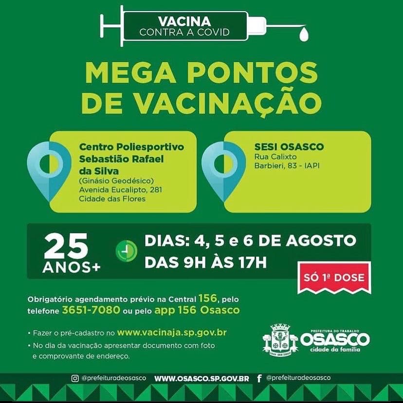 👉 De 4 a 6/8: dois mega pontos de vacinação para 25 anos ou mais (agendamento no App 156 Osasco ou na Central 156);