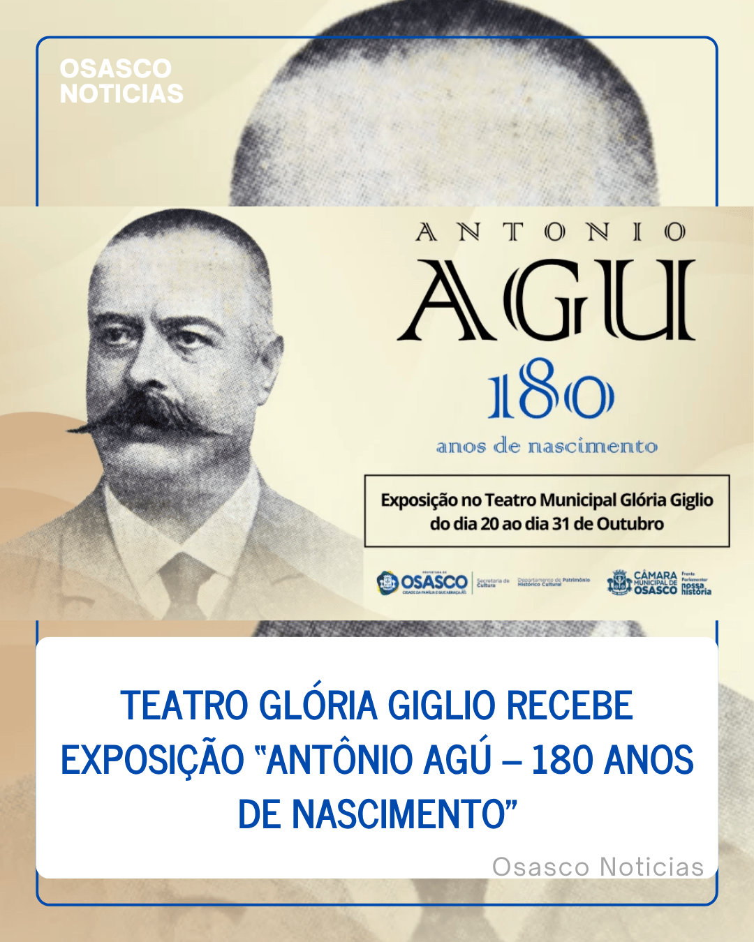 <p class="blog-single-title"><span style="font-size: 16px;">A Secretaria de Cultura da Prefeitura de Osasco, por meio do Departamento de Patrimônio Histórico e Cultural e do Setor de Comunicação, realiza a Exposição “Antônio Agú – 180 Anos de Nascimento”, de 20 a 31 de outubro, no Hall do Teatro Municipal Glória Giglio, em conjunto com a Frente Parlamentar do Programa Nossa História, da Câmara Municipal de Osasco.</span></p>